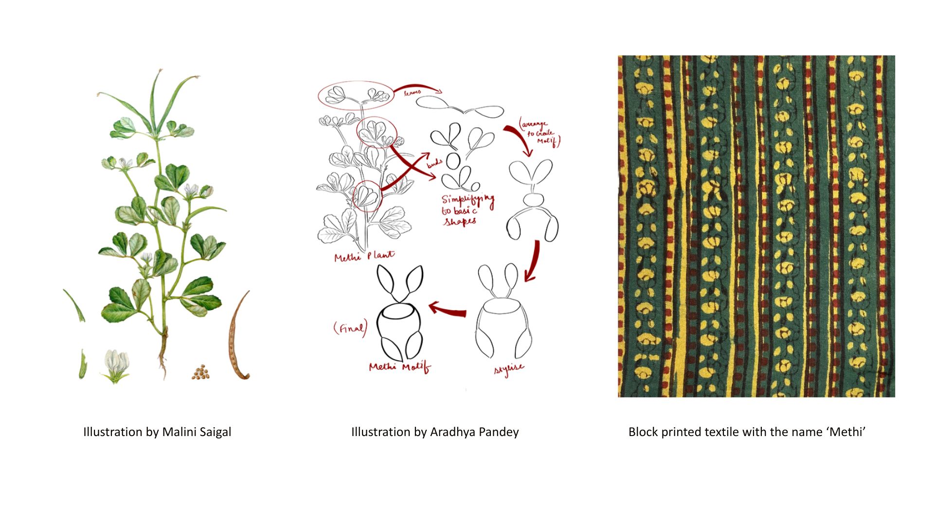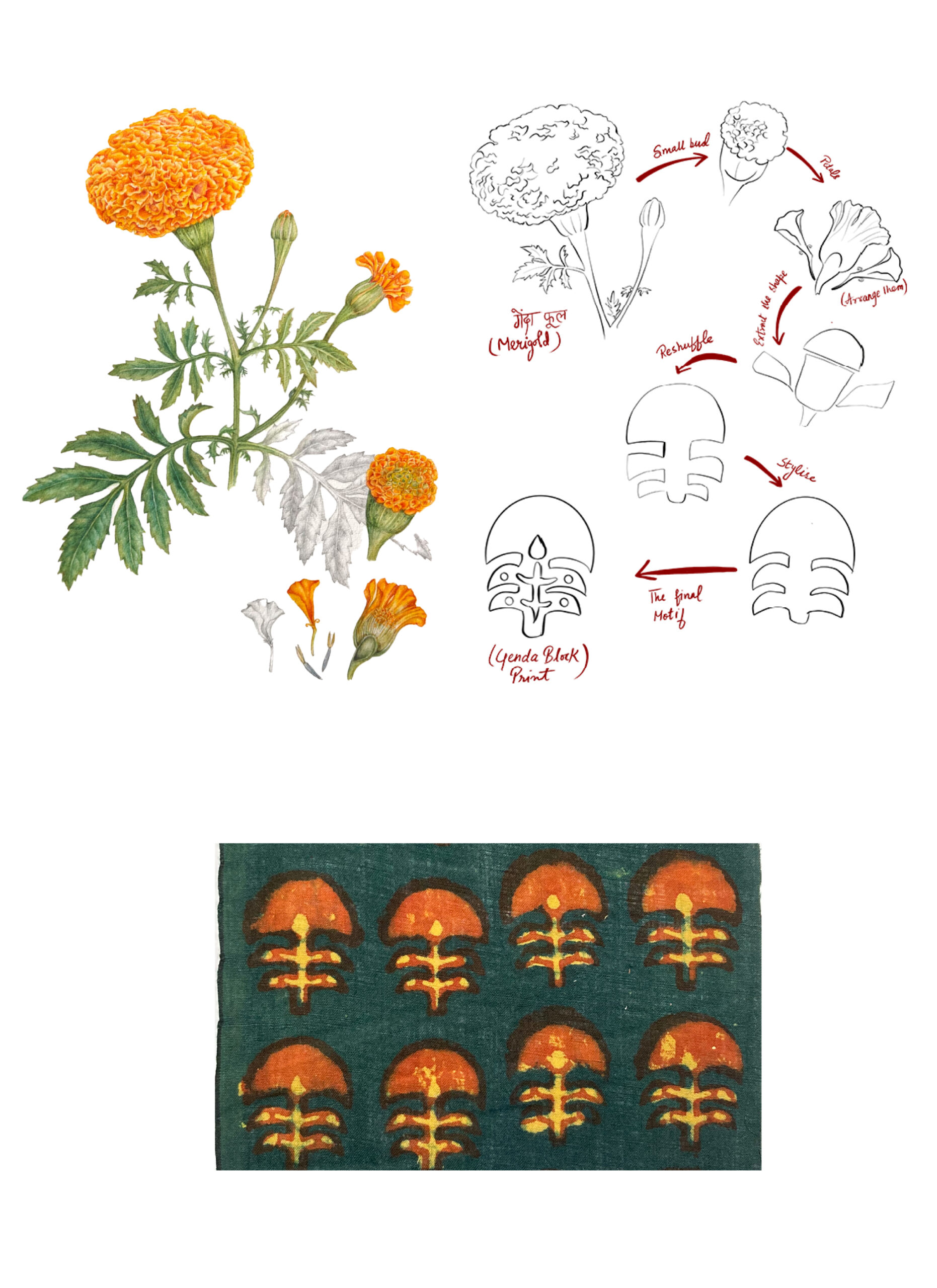 A central focus of Meena’s research is understanding how realistic plant forms are transformed into minimal, repeatable motifs. This process involves significant abstraction. For instance, the akara plant is simplified into a geometric motif suitable for block printing. Similarly, the tobacco plant is reduced to essential elements – leaf, flower, outline, and fill – while maintaining its identity. In another example, a marigold (genda) is first depicted in detail by a miniature artist from Kota, then gradually simplified into a block-print design. These exercises, conducted with students and artists, aim to reconstruct the cognitive process of the block carver.
